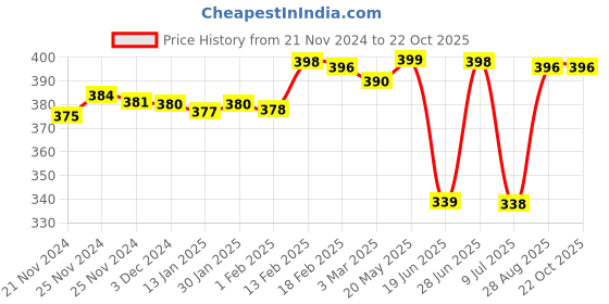 The current price is ₹396, which is ₹58 (17.2%) higher than the best price of ₹338 last seen on 9 Jul 2025. Over the 334 day price history period, prices have ranged from ₹338 to ₹399, with an average of ₹382. The pricing has been quite stable with low volatility, but the overall trend is concerning as prices are getting more expensive. In terms of recent activity, there have been 0 price changes this week, 0 this month, and 14 over the past year. If you need this product now, it's a reasonable time to buy as prices are stable, but you might want to monitor for potential better deals.
