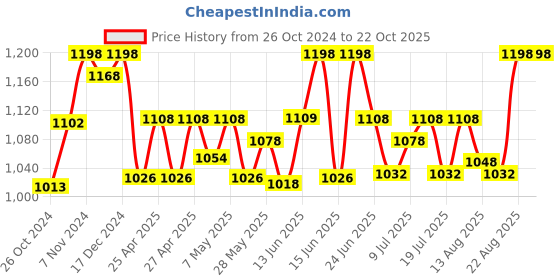The current price is ₹1,198, which is ₹185 (18.3%) higher than the best price of ₹1,013 last seen on 26 Oct 2024. Over the 360 day price history period, prices have ranged from ₹1,013 to ₹1,198, with an average of ₹1,097. The pricing shows moderate volatility, but the overall trend is concerning as prices are getting more expensive. In terms of recent activity, there have been 0 price changes this week, 0 this month, and 26 over the past year. Consider waiting before making a purchase as prices are rising and better deals may be available later.