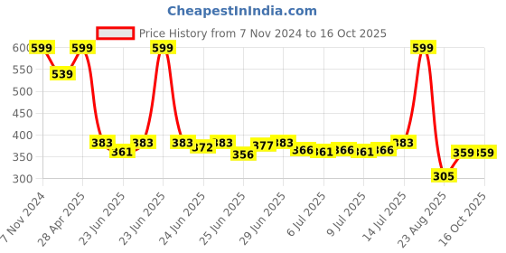The current price is ₹359, which is ₹54 (17.7%) higher than the best price of ₹305 last seen on 23 Aug 2025. Over the 343 day price history period, prices have ranged from ₹305 to ₹599, with an average of ₹415. The pricing shows high volatility with significant fluctuations, and the overall trend is favorable for consumers as prices are getting cheaper. In terms of recent activity, there have been 0 price changes this week, 0 this month, and 21 over the past year. If you need this product now, it's a reasonable time to buy as prices are stable, but you might want to monitor for potential better deals.