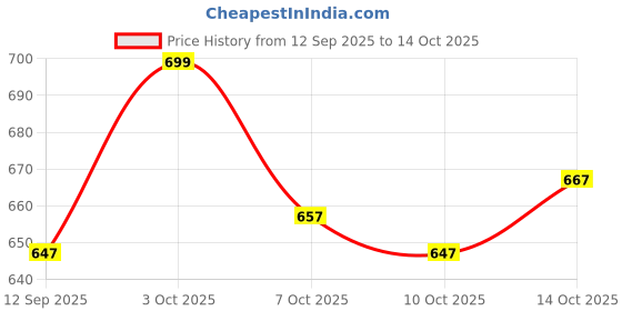 The current price is ₹667, which is ₹20 (3.1%) higher than the best price of ₹647 last seen on 12 Sep 2025. Over the 32 day price history period, prices have ranged from ₹647 to ₹699, with an average of ₹663. The pricing has been quite stable with low volatility, with prices remaining relatively stable overall. In terms of recent activity, there has been 1 price change this week, 3 this month, and 4 over the past year. If you need this product now, it's a reasonable time to buy as prices are stable, but you might want to monitor for potential better deals.