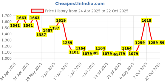 The current price is ₹1,259, which is ₹194 (18.2%) higher than the best price of ₹1,065 last seen on 21 Jul 2025. Over the 180 day price history period, prices have ranged from ₹1,065 to ₹1,663, with an average of ₹1,308. The pricing shows high volatility with significant fluctuations, and the overall trend is favorable for consumers as prices are getting cheaper. In terms of recent activity, there have been 0 price changes this week, 1 this month, and 21 over the past year. This is an excellent time to make a purchase as prices are trending downward and conditions appear favorable.