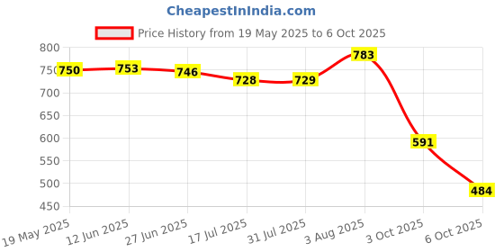 Great news for shoppers! The current price of ₹484 is at its best ever level. Over the 140 day price history period, prices have ranged from ₹484 to ₹783, with an average of ₹696. The pricing shows moderate volatility, and the overall trend is favorable for consumers as prices are getting cheaper. In terms of recent activity, there have been 0 price changes this week, 1 this month, and 7 over the past year. This is an excellent time to make a purchase as prices are trending downward and conditions appear favorable.