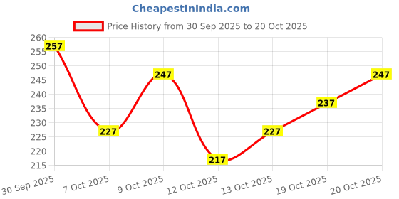 The current price is ₹247, which is ₹30 (13.8%) higher than the best price of ₹217 last seen on 12 Oct 2025. Over the 20 day price history period, prices have ranged from ₹217 to ₹257, with an average of ₹237. The pricing shows moderate volatility, with prices remaining relatively stable overall. In terms of recent activity, there has been 1 price change this week, 6 this month, and 6 over the past year. If you need this product now, it's a reasonable time to buy as prices are stable, but you might want to monitor for potential better deals.