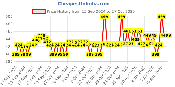 The current price is ₹449, which is ₹50 (12.5%) higher than the best price of ₹399 last seen on 13 Sep 2024. Over the 398 day price history period, prices have ranged from ₹399 to ₹499, with an average of ₹431. The pricing shows moderate volatility, but the overall trend is concerning as prices are getting more expensive. In terms of recent activity, there have been 0 price changes this week, 0 this month, and 27 over the past year. If you need this product now, it's a reasonable time to buy as prices are stable, but you might want to monitor for potential better deals.