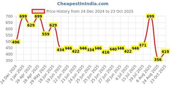 The current price is ₹419, which is ₹63 (17.7%) higher than the best price of ₹356 last seen on 24 Aug 2025. Over the 303 day price history period, prices have ranged from ₹356 to ₹699, with an average of ₹498. The pricing shows high volatility with significant fluctuations, and the overall trend is favorable for consumers as prices are getting cheaper. In terms of recent activity, there have been 0 price changes this week, 0 this month, and 20 over the past year. This is an excellent time to make a purchase as prices are trending downward and conditions appear favorable.