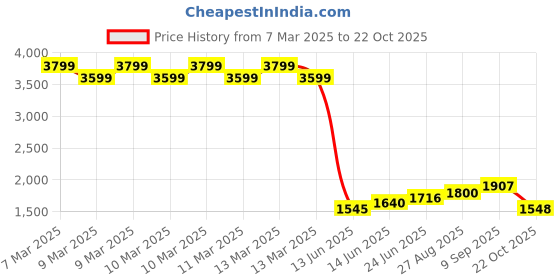 The current price is ₹1,548, which is ₹3 (0.2%) higher than the best price of ₹1,545 last seen on 13 Jun 2025. Over the 229 day price history period, prices have ranged from ₹1,545 to ₹3,799, with an average of ₹2,839. The pricing shows high volatility with significant fluctuations, and the overall trend is favorable for consumers as prices are getting cheaper. In terms of recent activity, there have been 0 price changes this week, 0 this month, and 13 over the past year. This is an excellent time to make a purchase as prices are trending downward and conditions appear favorable.