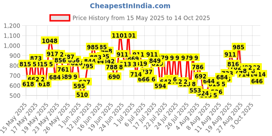 The current price is ₹714, which is ₹209 (41.4%) higher than the best price of ₹505 last seen on 7 Aug 2025. Over the 152 day price history period, prices have ranged from ₹505 to ₹1,101, with an average of ₹769. The pricing shows high volatility with significant fluctuations, and the overall trend is favorable for consumers as prices are getting cheaper. In terms of recent activity, there have been 0 price changes this week, 3 this month, and 87 over the past year. If you need this product now, it's a reasonable time to buy as prices are stable, but you might want to monitor for potential better deals.