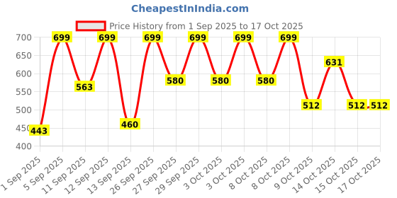 The current price is ₹512, which is ₹69 (15.6%) higher than the best price of ₹443 last seen on 1 Sep 2025. Over the 45 day price history period, prices have ranged from ₹443 to ₹699, with an average of ₹598. The pricing shows high volatility with significant fluctuations, but the overall trend is concerning as prices are getting more expensive. In terms of recent activity, there has been 1 price change this week, 9 this month, and 14 over the past year. The price direction is uncertain, so monitor the situation for a few more days before making a decision.