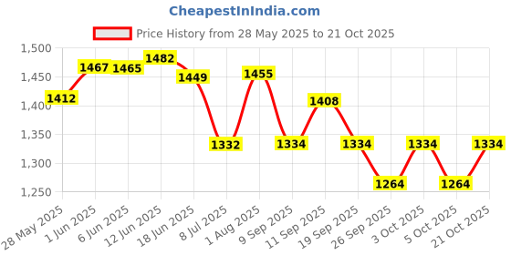 The current price is ₹1,334, which is ₹70 (5.5%) higher than the best price of ₹1,264 last seen on 26 Sep 2025. Over the 146 day price history period, prices have ranged from ₹1,264 to ₹1,482, with an average of ₹1,381. The pricing shows moderate volatility, and the overall trend is favorable for consumers as prices are getting cheaper. In terms of recent activity, there have been 0 price changes this week, 3 this month, and 13 over the past year. If you need this product now, it's a reasonable time to buy as prices are stable, but you might want to monitor for potential better deals.
