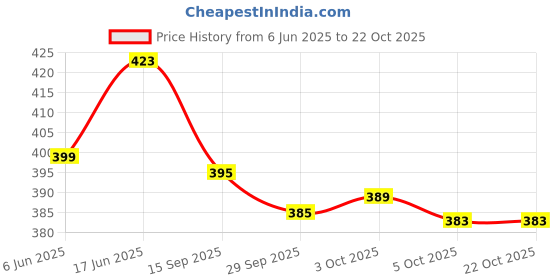 Exciting update! The current price of ₹383 is at its best ever level. Over the 137 day price history period, prices have ranged from ₹383 to ₹423, with an average of ₹394. The pricing has been quite stable with low volatility, with prices remaining relatively stable overall. In terms of recent activity, there have been 0 price changes this week, 2 this month, and 5 over the past year. If you need this product now, it's a reasonable time to buy as prices are stable, but you might want to monitor for potential better deals.