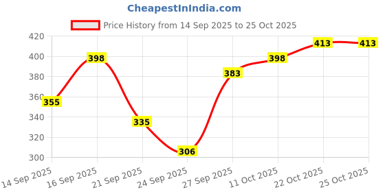 The current price is ₹413, which is ₹107 (35.0%) higher than the best price of ₹306 last seen on 24 Sep 2025. Over the 38 day price history period, prices have ranged from ₹306 to ₹413, with an average of ₹370. The pricing shows moderate volatility, but the overall trend is concerning as prices are getting more expensive. In terms of recent activity, there have been 0 price changes this week, 2 this month, and 6 over the past year. If you need this product now, it's a reasonable time to buy as prices are stable, but you might want to monitor for potential better deals.