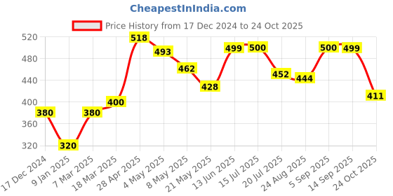 The current price is ₹411, which is ₹91 (28.4%) higher than the best price of ₹320 last seen on 9 Jan 2025. Over the 311 day price history period, prices have ranged from ₹320 to ₹518, with an average of ₹446. The pricing shows moderate volatility, but the overall trend is concerning as prices are getting more expensive. In terms of recent activity, there have been 0 price changes this week, 0 this month, and 14 over the past year. If you need this product now, it's a reasonable time to buy as prices are stable, but you might want to monitor for potential better deals.