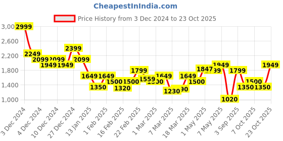 The current price is ₹1,949, which is ₹929 (91.1%) higher than the best price of ₹1,020 last seen on 6 Jun 2025. Over the 324 day price history period, prices have ranged from ₹1,020 to ₹2,999, with an average of ₹1,727. The pricing shows high volatility with significant fluctuations, and the overall trend is favorable for consumers as prices are getting cheaper. In terms of recent activity, there have been 0 price changes this week, 2 this month, and 30 over the past year. The price direction is uncertain, so monitor the situation for a few more days before making a decision.