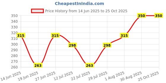 The current price is ₹350, which is ₹87 (33.1%) higher than the best price of ₹263 last seen on 19 Jun 2025. Over the 132 day price history period, prices have ranged from ₹263 to ₹350, with an average of ₹307. The pricing shows moderate volatility, but the overall trend is concerning as prices are getting more expensive. In terms of recent activity, there have been 0 price changes this week, 0 this month, and 7 over the past year. If you need this product now, it's a reasonable time to buy as prices are stable, but you might want to monitor for potential better deals.