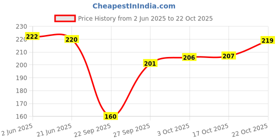 The current price is ₹219, which is ₹59 (36.9%) higher than the best price of ₹160 last seen on 22 Sep 2025. Over the 142 day price history period, prices have ranged from ₹160 to ₹222, with an average of ₹205. The pricing shows moderate volatility, with prices remaining relatively stable overall. In terms of recent activity, there have been 0 price changes this week, 3 this month, and 6 over the past year. If you need this product now, it's a reasonable time to buy as prices are stable, but you might want to monitor for potential better deals.