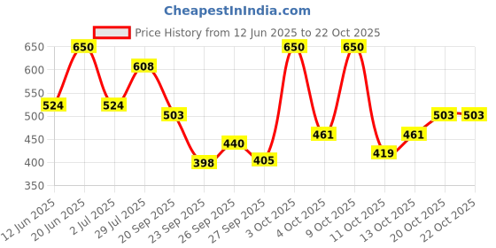 The current price is ₹503, which is ₹105 (26.4%) higher than the best price of ₹398 last seen on 23 Sep 2025. Over the 131 day price history period, prices have ranged from ₹398 to ₹650, with an average of ₹513. The pricing shows high volatility with significant fluctuations, with prices remaining relatively stable overall. In terms of recent activity, there have been 0 price changes this week, 8 this month, and 13 over the past year. If you need this product now, it's a reasonable time to buy as prices are stable, but you might want to monitor for potential better deals.