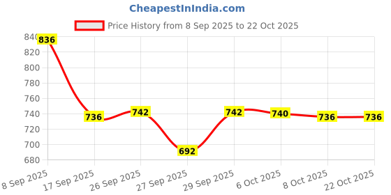 The current price is ₹736, which is ₹44 (6.4%) higher than the best price of ₹692 last seen on 27 Sep 2025. Over the 43 day price history period, prices have ranged from ₹692 to ₹836, with an average of ₹745. The pricing shows moderate volatility, and the overall trend is favorable for consumers as prices are getting cheaper. In terms of recent activity, there have been 0 price changes this week, 4 this month, and 6 over the past year. If you need this product now, it's a reasonable time to buy as prices are stable, but you might want to monitor for potential better deals.