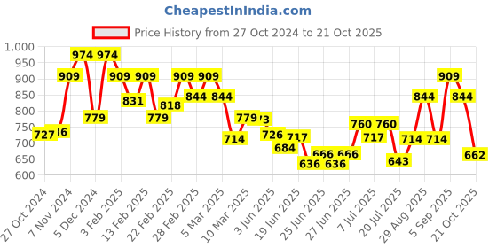 The current price is ₹662, which is ₹26 (4.1%) higher than the best price of ₹636 last seen on 22 Jun 2025. Over the 359 day price history period, prices have ranged from ₹636 to ₹974, with an average of ₹783. The pricing shows moderate volatility, and the overall trend is favorable for consumers as prices are getting cheaper. In terms of recent activity, there have been 0 price changes this week, 1 this month, and 34 over the past year. This is an excellent time to make a purchase as prices are trending downward and conditions appear favorable.
