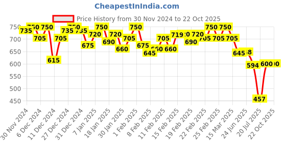 The current price is ₹600, which is ₹143 (31.3%) higher than the best price of ₹457 last seen on 20 Jul 2025. Over the 325 day price history period, prices have ranged from ₹457 to ₹750, with an average of ₹689. The pricing shows moderate volatility, and the overall trend is favorable for consumers as prices are getting cheaper. In terms of recent activity, there have been 0 price changes this week, 0 this month, and 35 over the past year. The price direction is uncertain, so monitor the situation for a few more days before making a decision.