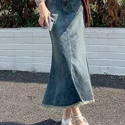 SHOWOFF Women Washed Denim Front Slit A-Line Maxi Skirt