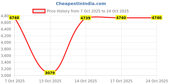 The current price is ₹4,740, which is ₹1,661 (53.9%) higher than the best price of ₹3,079 last seen on 13 Oct 2025. Over the 17 day price history period, prices have ranged from ₹3,079 to ₹4,740, with an average of ₹4,408. The pricing shows high volatility with significant fluctuations, with prices remaining relatively stable overall. In terms of recent activity, there have been 0 price changes this week, 3 this month, and 3 over the past year. If you need this product now, it's a reasonable time to buy as prices are stable, but you might want to monitor for potential better deals.