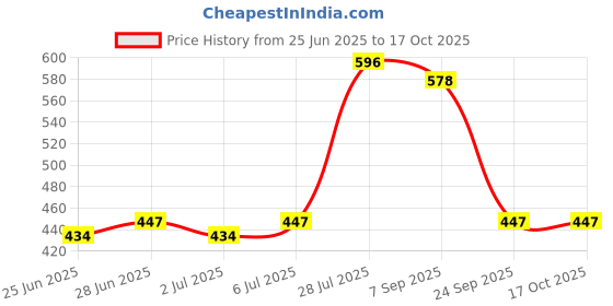 The current price is ₹447, which is ₹13 (3.0%) higher than the best price of ₹434 last seen on 25 Jun 2025. Over the 113 day price history period, prices have ranged from ₹434 to ₹596, with an average of ₹479. The pricing shows moderate volatility, with prices remaining relatively stable overall. In terms of recent activity, there have been 0 price changes this week, 0 this month, and 6 over the past year. The price direction is uncertain, so monitor the situation for a few more days before making a decision.