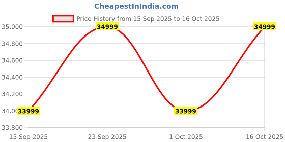 The current price is ₹34,999, which is ₹1,000 (2.9%) higher than the best price of ₹33,999 last seen on 15 Sep 2025. Over the 31 day price history period, prices have ranged from ₹33,999 to ₹34,999, with an average of ₹34,499. The pricing has been quite stable with low volatility, with prices remaining relatively stable overall. In terms of recent activity, there have been 0 price changes this week, 2 this month, and 3 over the past year. If you need this product now, it's a reasonable time to buy as prices are stable, but you might want to monitor for potential better deals.