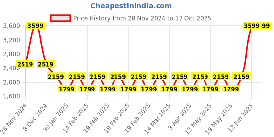 The current price is ₹3,599, which is ₹1,799.5 (100.0%) higher than the best price of ₹1,799.5 last seen on 30 Jan 2025. Over the 322 day price history period, prices have ranged from ₹1,799.5 to ₹3,599, with an average of ₹2,234. The pricing shows high volatility with significant fluctuations, but the overall trend is concerning as prices are getting more expensive. In terms of recent activity, there have been 0 price changes this week, 0 this month, and 22 over the past year. Consider waiting before making a purchase as prices are rising and better deals may be available later.