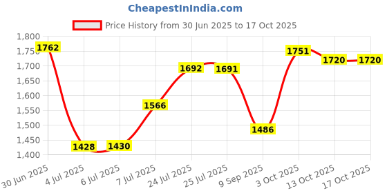 The current price is ₹1,720, which is ₹292 (20.4%) higher than the best price of ₹1,428 last seen on 4 Jul 2025. Over the 108 day price history period, prices have ranged from ₹1,428 to ₹1,762, with an average of ₹1,625. The pricing shows moderate volatility, with prices remaining relatively stable overall. In terms of recent activity, there have been 0 price changes this week, 1 this month, and 8 over the past year. If you need this product now, it's a reasonable time to buy as prices are stable, but you might want to monitor for potential better deals.