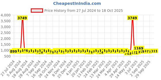 The current price is ₹928, which is ₹179 (23.9%) higher than the best price of ₹749 last seen on 2 May 2025. Over the 448 day price history period, prices have ranged from ₹749 to ₹3,749, with an average of ₹1,007. The pricing shows high volatility with significant fluctuations, with prices remaining relatively stable overall. In terms of recent activity, there have been 0 price changes this week, 1 this month, and 46 over the past year. If you need this product now, it's a reasonable time to buy as prices are stable, but you might want to monitor for potential better deals.