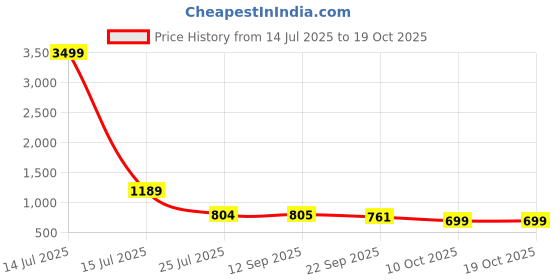 Exciting update! The current price of ₹699 is at its best ever level. Over the 96 day price history period, prices have ranged from ₹699 to ₹3,499, with an average of ₹1,208. The pricing shows high volatility with significant fluctuations, and the overall trend is favorable for consumers as prices are getting cheaper. In terms of recent activity, there have been 0 price changes this week, 1 this month, and 5 over the past year. If you need this product now, it's a reasonable time to buy as prices are stable, but you might want to monitor for potential better deals.