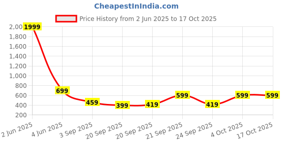 The current price is ₹599, which is ₹200 (50.1%) higher than the best price of ₹399 last seen on 20 Sep 2025. Over the 136 day price history period, prices have ranged from ₹399 to ₹1,999, with an average of ₹688. The pricing shows high volatility with significant fluctuations, and the overall trend is favorable for consumers as prices are getting cheaper. In terms of recent activity, there have been 0 price changes this week, 4 this month, and 7 over the past year. The price direction is uncertain, so monitor the situation for a few more days before making a decision.