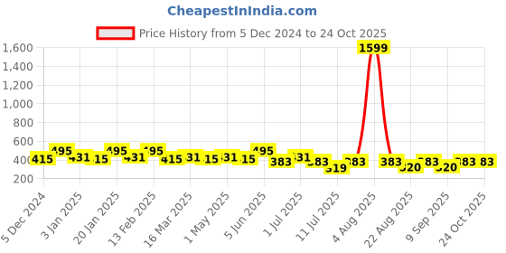The current price is ₹383, which is ₹64 (20.1%) higher than the best price of ₹319 last seen on 11 Jul 2025. Over the 323 day price history period, prices have ranged from ₹319 to ₹1,599, with an average of ₹458. The pricing shows high volatility with significant fluctuations, and the overall trend is favorable for consumers as prices are getting cheaper. In terms of recent activity, there have been 0 price changes this week, 0 this month, and 23 over the past year. If you need this product now, it's a reasonable time to buy as prices are stable, but you might want to monitor for potential better deals.