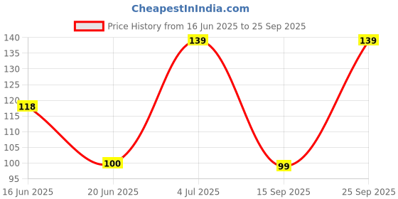 The current price is ₹139, which is ₹40 (40.4%) higher than the best price of ₹99 last seen on 15 Sep 2025. Over the 101 day price history period, prices have ranged from ₹99 to ₹139, with an average of ₹119. The pricing shows moderate volatility, but the overall trend is concerning as prices are getting more expensive. In terms of recent activity, there have been 0 price changes this week, 0 this month, and 4 over the past year. If you need this product now, it's a reasonable time to buy as prices are stable, but you might want to monitor for potential better deals.