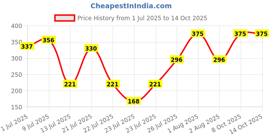The current price is ₹375, which is ₹207 (123.2%) higher than the best price of ₹168 last seen on 23 Jul 2025. Over the 104 day price history period, prices have ranged from ₹168 to ₹375, with an average of ₹298. The pricing shows high volatility with significant fluctuations, but the overall trend is concerning as prices are getting more expensive. In terms of recent activity, there have been 0 price changes this week, 0 this month, and 10 over the past year. If you need this product now, it's a reasonable time to buy as prices are stable, but you might want to monitor for potential better deals.