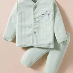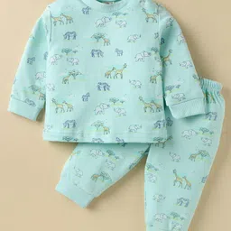 Zero Sinker Knit Full Sleeves Night Suit With Animal Print - Sea Green