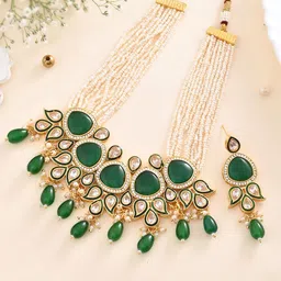 Anouk Women Gold-Plated White & Green Stone-Studded Pearl-Beaded Necklace with Earrings