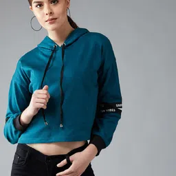DOLCE CRUDO Women Teal Blue Solid Hooded Sweatshirt