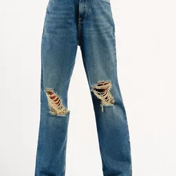 FREAKINS Women Straight Fit High-Rise Slash Knee Heavy Fade Cotton Jeans