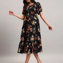 Jash Creation Floral Print Puff Sleeves Fit & Flare Midi Dress