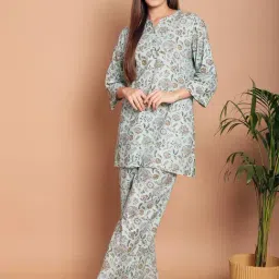 Kanvin Blue Cotton Printed Tunic Pyjamas Set