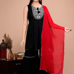 SHOOLIN Ethnic Motifs Embroidered Mirror Work A-Line Kurta With Sharara & With Dupatta