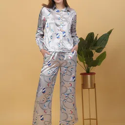 Sweet Dreams Women Shirt Collar Ethnic Motifs Printed Satin Shirt & Pyjamas Night Suit