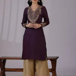W Purple Viscose Embroidered Three Quarter Sleeves Kurta